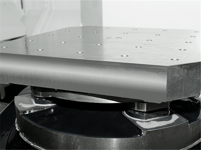 工作臺(tái)板與底座間采用四個(gè)大定位銷定位,同時(shí)兼具夾緊功能,可保證托盤剛性?shī)A緊和精確定位,托盤的重復(fù)定位精度高。工作臺(tái)旋轉(zhuǎn)采用高精度牙盤定位,分度精度高、承載大。