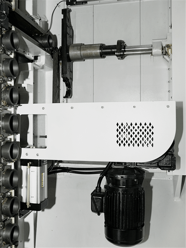 標(biāo)配40把伺服刀庫(kù),凸輪機(jī)械手與刀庫(kù)門實(shí)現(xiàn)聯(lián)動(dòng)控制,換刀時(shí)間2.5s。
